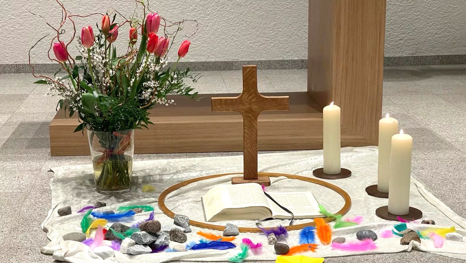 Jeden letzten Sonntag im Monat um 10 Uhr (außer in den Schulferien) feiern wir einen Gottesdienst für Kleine und Große, Junge und Alte. Man kann dabei eine Aufgabe übernehmen: die Kerze anzünden, den Altar schön machen, ein Gebet lesen…